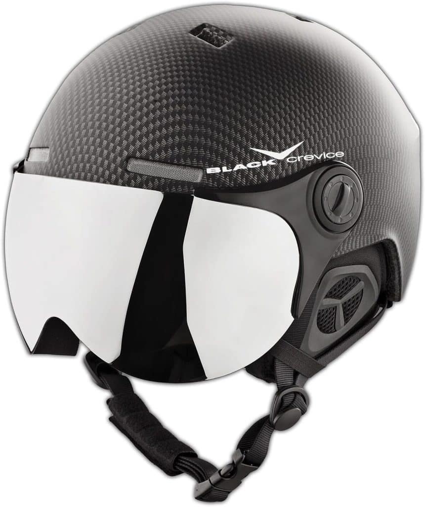 • BLACK CREVICE Casque de Ski pour Adulte de Style Pilote avec visière Amovible Orange supplémentaire, Noir Carbone/Blanc